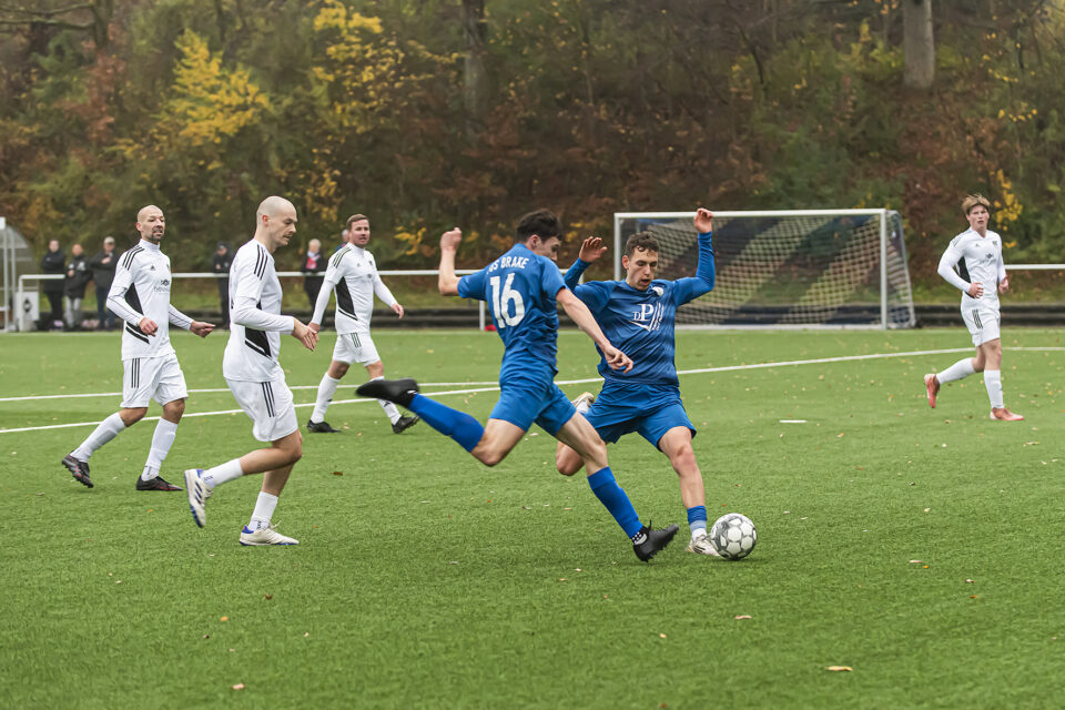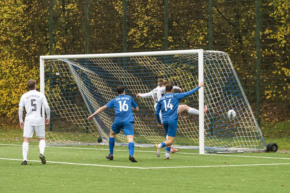 Bei regnerischem Herbstwetter wurde die sehr ambitionierte Mannschaft des TuS Bexterhagen mit 4 : 1 nach Hause geschickt. Brake setzte blitzsaubere Konter und erzielte so drei der vier Tore. Als in der zweiten Hälfte Bexterhagen immer feldüberlegener wurde, musste hart dagegen gearbeitet werden – und das machte die gesamte Mannschaft im Verbund hervorragend. Manuel Süllwold hatte recht, wenn er nach dem Abpfiff feststellte: „Wir können super kombinieren, aber wir können auch im Eins zu Eins dagegen halten.“