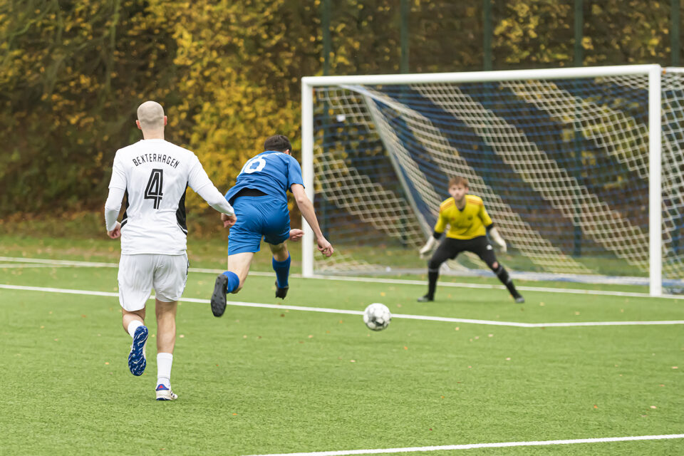 Schnell stand es 2 : 0. Bereits in der 5. Spielminute sah Norman Wehmeier beim Spielaufbau noch in der Mitte der eigenen Hälfte auf der rechten Außenbahn Julian Brune starten. Der sprintete in den Strafraum und schloss mit einem platzierten Flachschuss ab, den der Torhüter zunächst noch parieren konnte. Aber im Nachschuss verwandelte Jörn Pieper. Drei Minuten später holte Liam Sevgül clever einen Eckball heraus, den er dann selbst brandgefährlich vor das Tor schlug. Bennet Fiedler konnte zum 2 : 0 vollstrecken. In der 26. Minute fiel das 3 : 0. Mit direktem Kombinationsspiel ging es in höchstem Tempo durch das Mittelfeld, steil wurde in den Lauf von Christopher Mannel gespielt, der den scharfen flachen Querpass vor das Tor spielte, wo der heranstürmende Norman Wehmeier verwandelte. Die Bexterhagener Spieler sahen sich erstaunt an. So schnell und klar herausgespielte Tore hatten sie wohl lange nicht gesehen.